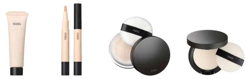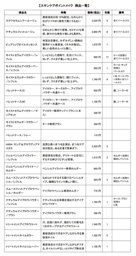 下:薬用 モイスチャーコントロールベース(しっとり)※6、薬用 タイムケア リキッドファンデーション(しっとり)オークル02※7、ブライトアップルースパウダー ナチュラルグロウ02、ナチュラルアイブロウパウダー、モイストセラムアイカラー クリーミィアイボリー18(下地)/オレンジブラウン01/シナモンブラウン09/スターダストブラウン11/トゥインクルヴェール14、モイストセラムチークカラー グロッシーハイライト01/ベージュコーラル03、スクワセラムシアールージュ カーネリアンレッド01、ジェルペンシルアイライナー ブラック01/ブラウン02、HABA ロング&グロウアップマスカラ ブラック01 ※6販売名 薬用 モイスチャーコントロールベース (しっとり) CN01 ※7販売名 薬用 タイムケア リキッドファンデーション (しっとり) OC02