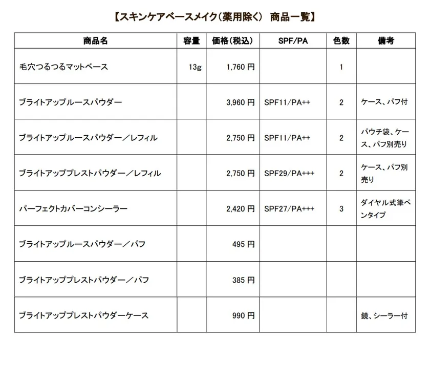 左より:毛穴つるつるマットベース(全1色)13g 1,760円、パーフェクトカバーコンシーラー(全3色)SPF27/PA+++ 2,420円、ブライトアップルースパウダー(全2色)ケース、パフ付きSPF11/PA++ 3,960円、ブライトアッププレストパウダー/レフィル(全2色)SPF29/PA+++ 2,750円、ブライトアッププレストパウダーケース 990円※鏡、シーラー付、ブライトアッププレストパウダー/パフ 385円