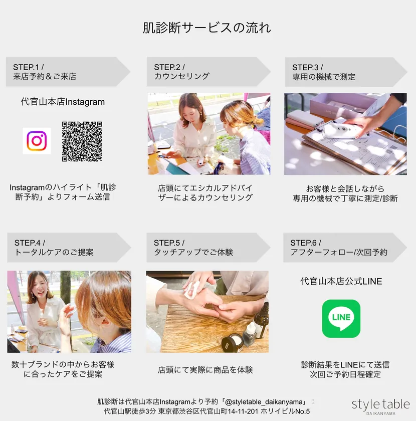 style table代官山本店Instagram(@styletable_daikanyama/ https://www.instagram.com/styletable_daikanyama/ )のハイライト「肌診断予約」もしくはフォーム( https://forms.gle/oEaXLo6Xa3PAEtTg8 )