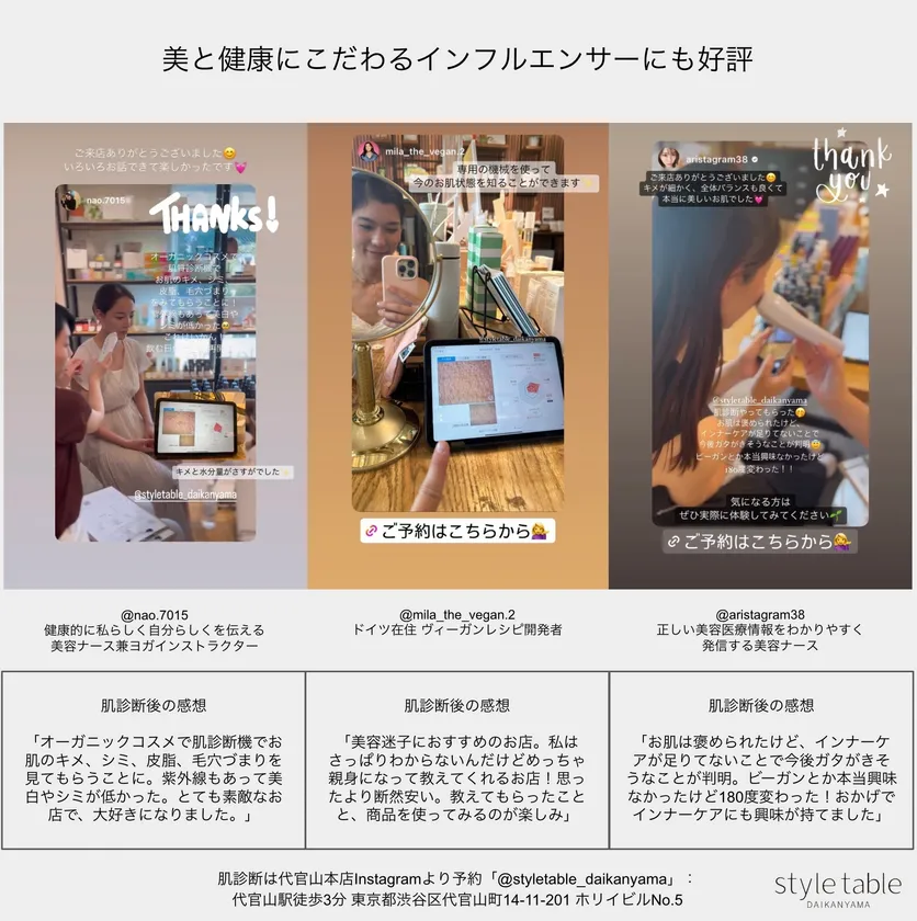 エシカルビューティーセレクトショップstyle table代官山本店は、美と健康にこだわるお客様からのご要望で5月より毎月肌診断WEEKを実施。インフルエンサー含むのべ1,000人以上が来店。