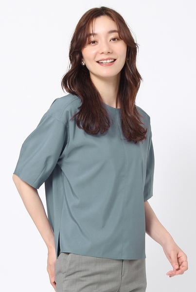 ブラウスは無地のクルーネック仕様で、シンプルながら袖デザインにバルーンスリーブを採用し、ふんわりとしたやわらかい印象に仕上げています。着丈は前後で差をつけて後ろ側をやや長めに設計。ボトムアウトでは腰回りに安心感を与える他、ボトムインではボトムからブラウスを出にくくするといった工夫を施しています。生地はシワになりにくく家庭洗濯も可能で、トップスとして1枚で着てもジャケットのインナーとしても使いやすい汎用性のある商品となっています。
