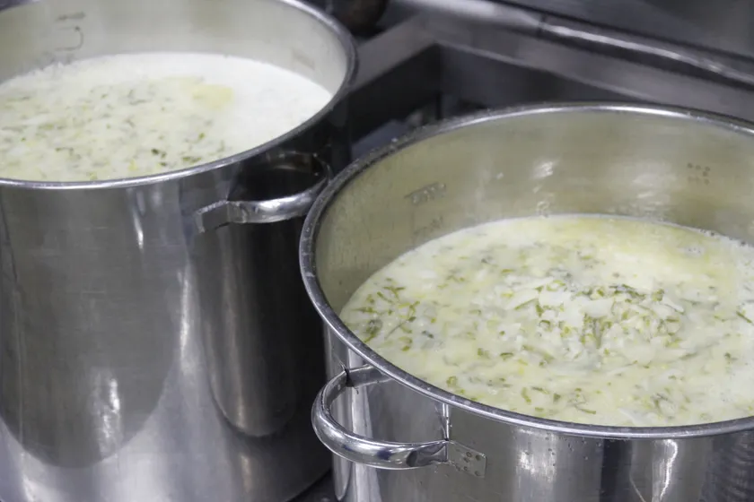 製造工程の最初に、ねぎの香りと甘みを引き出すために、バターでじっくりと炒めます。その後、じゃがいもを加え15分ほど煮込みます。素材のとろみが出てきたら機械を使い、ねぎとじゃがいもをなめらかなピューレー状にし、さらに煮込んで味をととのえ仕上げています。