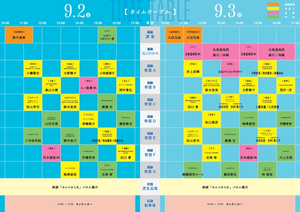 9月2日・3日ともに、午前11時から午後5時までの間、複数の教室で座談会が開催されます。参加者の方は自由に好きな会に参加いただくことができます。ぜひたくさんの登壇者の話を聞き、そこに集まった人たちと感じたことを共有してください。