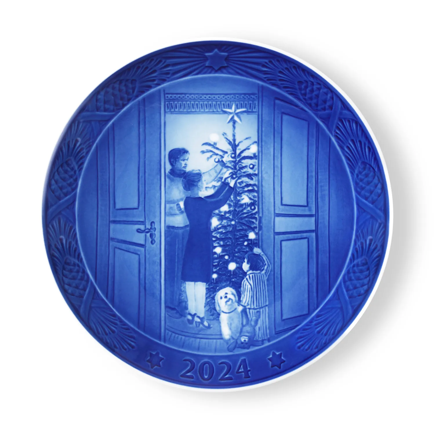 2024年版イヤープレートは、両親がツリーの飾りつけをしている間、眠っているはずだった男の子がベッドを抜け出し、犬と一緒に静かに見ている様子が描かれています。