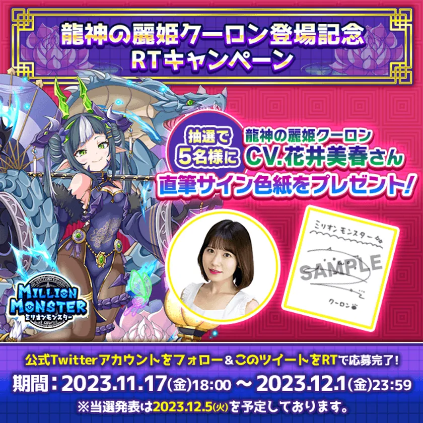 株式会社EX(所在地:東京都渋谷区、代表取締役:小野順季)は、iOS/Android端末用スマホRPG「ミリオンモンスター」の新キャラクター「龍神の麗姫クーロン」リリースに伴い、声優を務める「花井美春」さんの直筆サイン色紙が当たるプレゼントキャンペーンを2023年11月17日(金) 18:00より開催いたします。