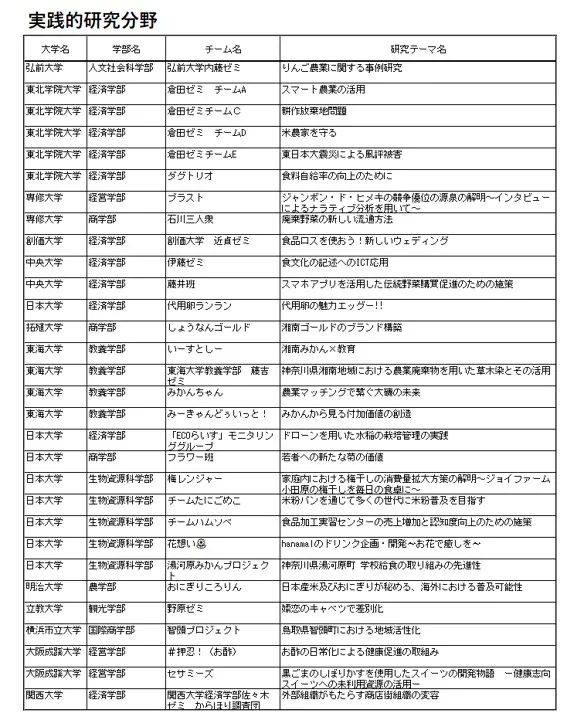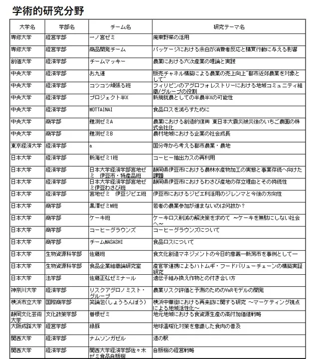 アグコンは、国内食料自給率の低下や地域の過疎化・高齢化など、日本の農・食・地域・JAをとりまく課題について、若い世代に自分事として考えてもらう機会として、平成29年から始まった大会です。発表分野は、(1)学術的研究分野と(2)実践的研究分野に分かれ、それぞれの分野から最優秀賞(1チーム)と優秀賞(1チーム)等を選出のうえ表彰します。今大会は、16大学から、学術的分野27チーム、実践的分野30チームの計57チームが参加予定です(下記参照)。