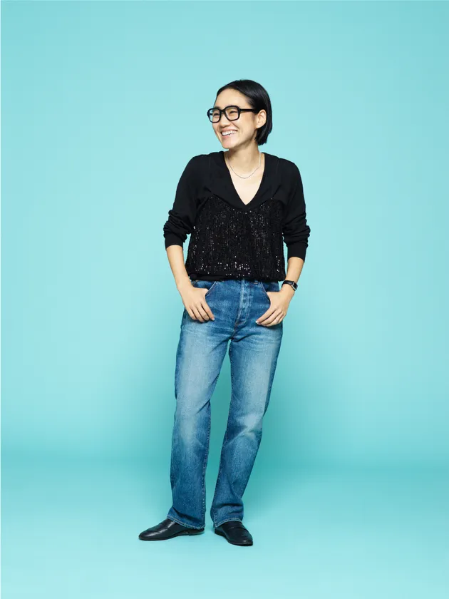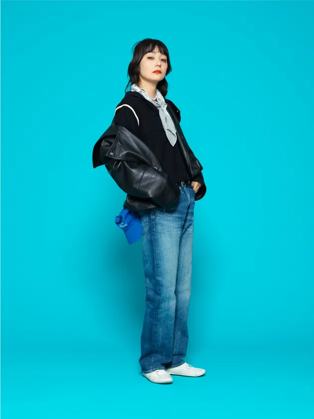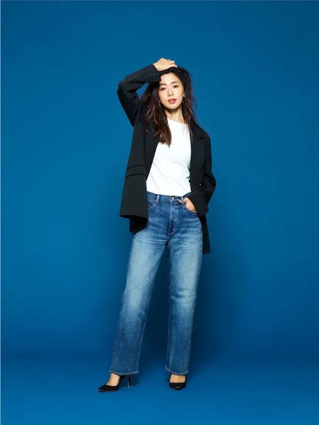 「YANUK20周年おめでとうございます!こだわりの強い私ですが、いつもYANUKさんとのお仕事はプロフェッショナルな皆さんと一緒に楽しく取り組ませていただいています。出来上がったデニムはどれも長年愛用できるたしかな品質のものばかり。昨年、岡山の工場を訪れ、実際にデニムが創られる丁寧な過程を拝見して20年来永く愛される理由がわかりました。益々YANUKの大ファンに!今回はとっても正統派なブルーデニムなのでオーセンティックな白Tシャツとブラックジャケットで合わせました。サイズを少し大きめにメンズライクに落として穿いているので、小物やヘアメイクはヒールや赤リップで逆に女性らしく。ギャップを楽しむようなコーディネートしました」