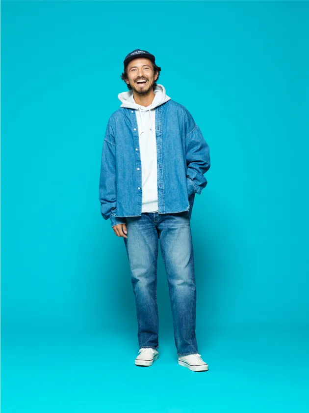 「20周年おめでとうございます。YANUKはとても優しく、時に力強く包み込んでくれるようなデニムで大ファンです!これからもいちファンとして応援しております!!今回のコーディネートは、ちょうど今朝、海から上がった時の気分で決めました。ブルーのデニム・オン・デニムで爽やかに」