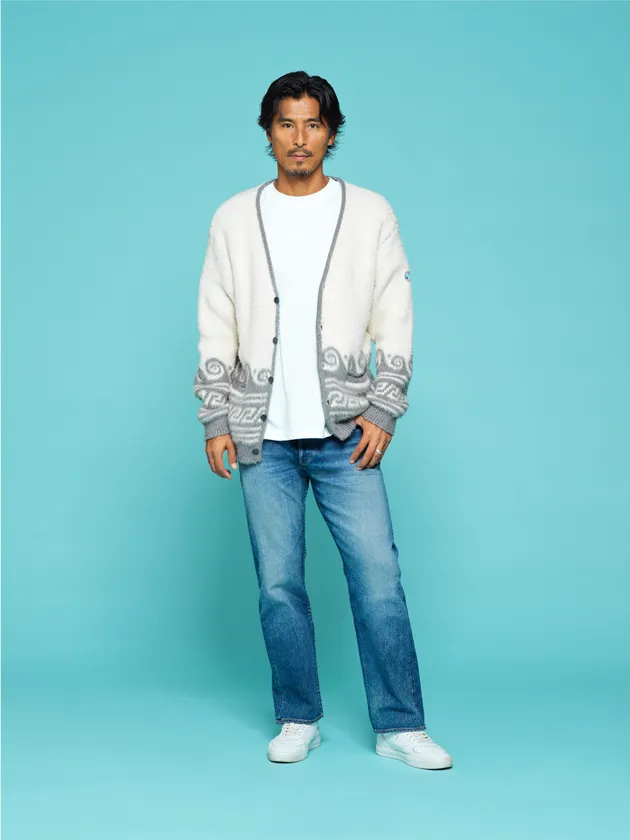 「20周年おめでとうございます!!YANUKのデニムは穿き心地が良く、ストレスフリーなのでとても気に入ってます。そして今、自分の勝負デニムとして絶賛大活躍中です!これからも良きバディとして10年20年と一緒に歩んでいけたらいいなと思います。王道ストレートシルエットにはあえてシンプルなコーデを。YANUKのジャカード柄の着心地の良いカーディガンにインナーとシューズは白を入れて爽やかな印象にしました」