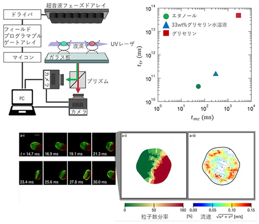 7×7に超音波振動子を配列した超音波フェーズドアレイに40kHzの位相が制御された音波を発信すると、任意の位置に音の焦点を発生させることができる。各振動子から送信される音の位相を、フィールドプログラマブルゲートアレイ注4)を用いて500Hzの周波数で切り替えることで、それぞれに蛍光粒子を混入した2つの液滴を浮遊させることができた(左上)。振動中の液滴内の各蛍光粒子を可視化するとともに(左下)、ボロノイ図注5)を用いて蛍光粒子の数分率から混合の進行度を見積もり、液滴内の流れ場を分析した(右下)。粘性の異なる3種類の液体を用いて実験した結果、液滴の混合に要する時間スケールtmcと、蛍光粒子の拡散に要する時間スケールttrの間に強い相関があること(右上)を確認し、液滴界面の振動により液滴内の混合過程を定量的に示すことに成功した。