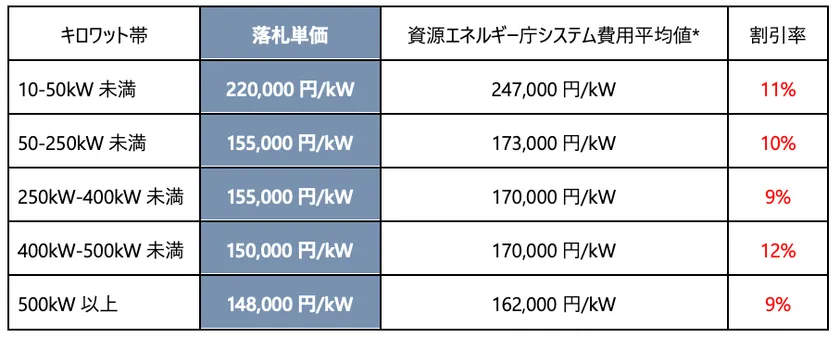 「太陽光発電設備の共同購入事業に関する協定」( https://www.pref.kanagawa.jp/docs/ap4/images/jointpurchase_business.html )に基づき、事業者用太陽光発電設備の共同購入を神奈川県内で実施、令和5年10月16日に複数の販売施工事業者による入札の結果、最も好条件を提案した販売施工事業者に落札が決定しました。入札単価は下記図表参照。
