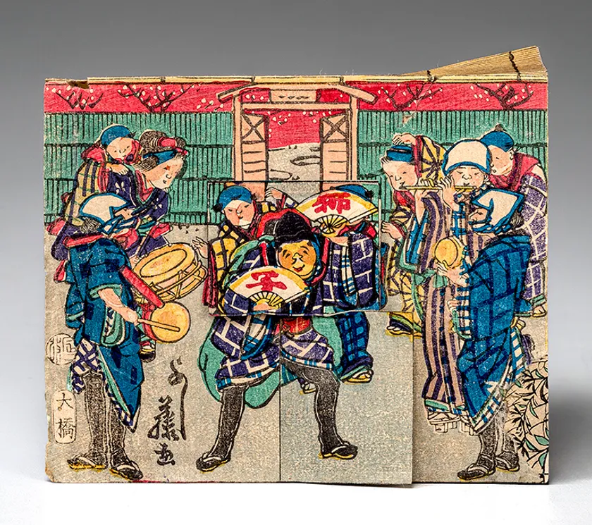 写真は組み上げた状態ですが、畳むこともできます。後世まで残ることが少ないおもちゃ絵の中で、一部欠けはあるものの、当時のままの形で残った珍しい例です。この作品は自分で組み立てる細工物ではなく、この状態で売られていたと思われます。