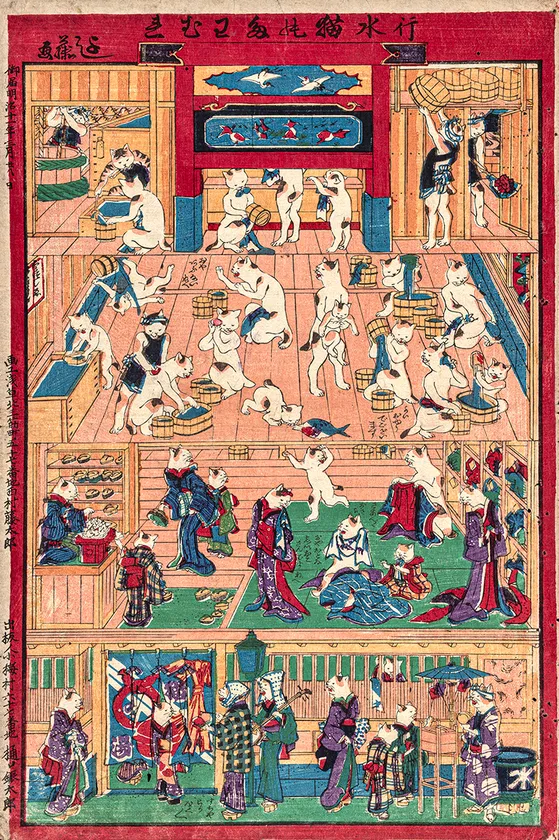 擬人化した猫の絵ですが、着物を脱いだ猫がより猫らしく見える楽しい作品。猫がお湯に入っている絵はほかにも数多く出版されています。