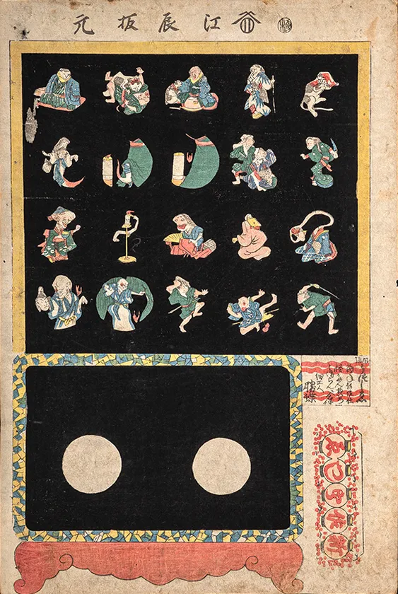 文政から天保にかけて、写し絵のおもちゃ絵が流行しました。黒い背景に丸枠で小さな絵が描かれているのは、幻灯機のレンズの形に由来しているようです。おもちゃ絵の画面に、覗き台が一緒に描かれているものは、そこに描かれた丸をくり抜いて絵をのぞかせて遊んだのでしょう。対のようにも見えるこの2点は、江崎屋辰蔵が出版したものです。