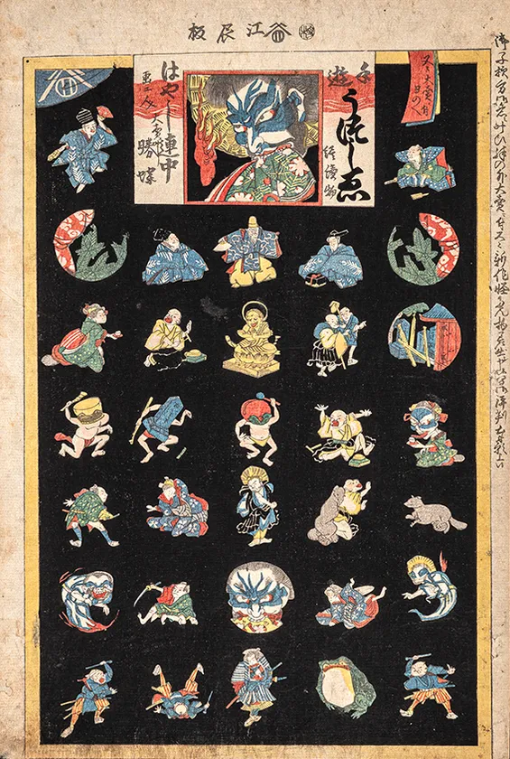 江戸から明治にかけて、おもちゃ絵と呼ばれる主に子ども向けの浮世絵が作られていました。おもちゃ絵には、“虫尽くし”や“道具尽くし”といった同じカテゴリーのものを一枚に集めて描いた「物尽くし」、昔話など話の起承転結を一枚の絵にまとめた「物語」、切り抜いたり組み立てたりする現在のペーパークラフトのような「細工物」、絵双六や十六むさしといった「ゲーム」と、大きく4つのジャンルがあります。