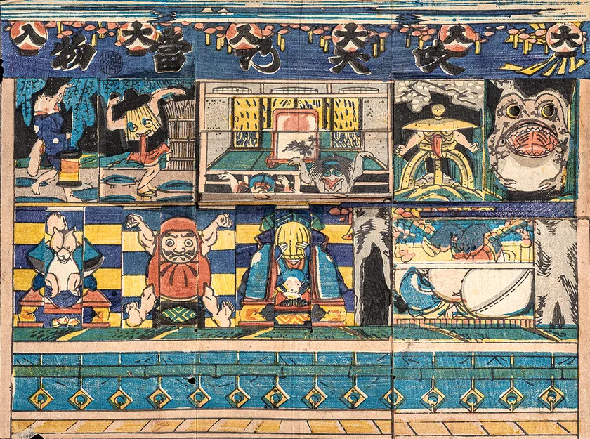 第一部では、天神様、祭礼、相撲、役者、忠臣蔵などをテーマにしたものや、おもちゃ絵を多数出版した版元にスポットを当て、物尽くしや細工物、物語、ゲームなど、さまざまなジャンルのおもちゃ絵約170点を紹介します。