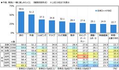 また、今後、家族と一緒に楽しみたいことを聞いたところ、「旅行」(59.6%)が最も高くなり、「外食」(51.2%)、「ショッピング」(37.3%)、「ドライブ」(34.8%)、「テレビ視聴」(32.1%)が続きました。「旅行」は“普段、家族と一緒に楽しんでいること”では3位だったのに対し、“今後、家族と一緒に楽しみたいこと”では1位となりました。新型コロナウイルス感染症が感染症法上5類へ移行されて約半年が経過し、家族旅行を具体的に計画している人やこれから満喫したいと考えている人は増加傾向にあるのではないでしょうか。