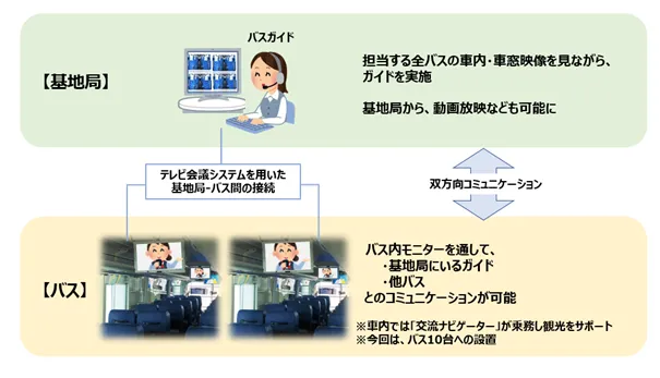 モニター越しながら車内のお客さまが基地局のバスガイドとコミュニケーションを取ることもでき、今までと変わらずご質問やお問い合わせにもリアルタイムにお応えします。また、車内では「交流ナビゲーター」が乗務し、目的地までのアテンド等、バスガイドに代わってお客さまをサポートいたします。