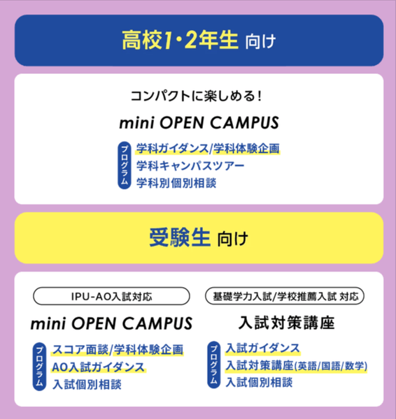 2024年8月29日 16:009月16日、IPU・環太平洋大学でミニオープンキャンパスを開催!高校1・2年生は学科ガイダンスや体験企画で進路探究を、受験生はAO入試ガイダンスや入試対策講座(英数国)で大学入試を徹底サポート。キャンパスツアーも実施し、大学の魅力をたっぷりとお伝えします。
