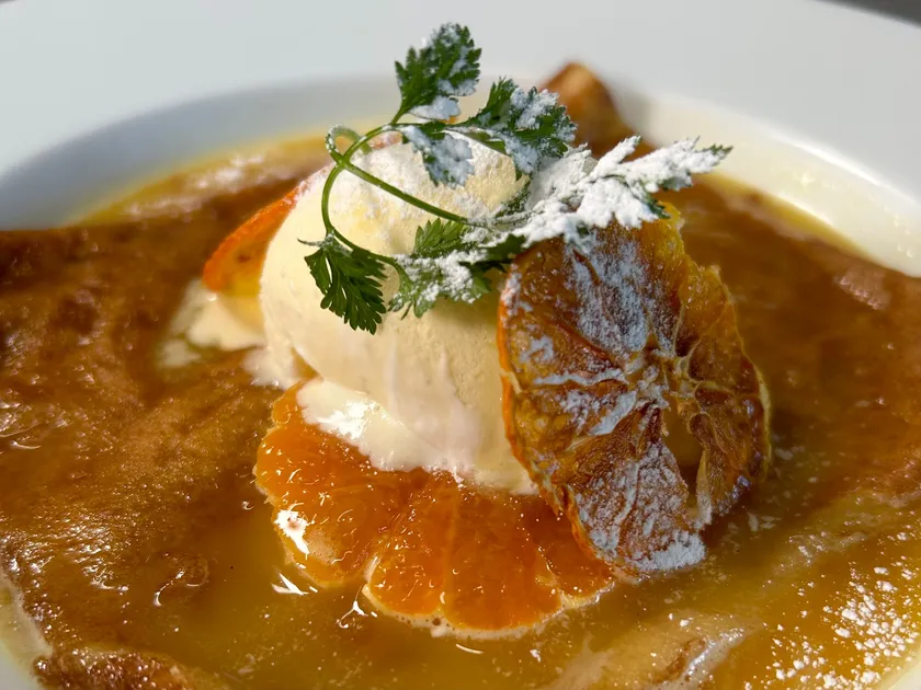 フランスの伝統的なデザート「シュゼット」。オレンジの香りとリキュールの華やかな風味がお口いっぱいに広がります。