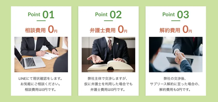 当社主体で交渉しますが、仮に弁護士を利用した場合でも弁護士費用は0円です。