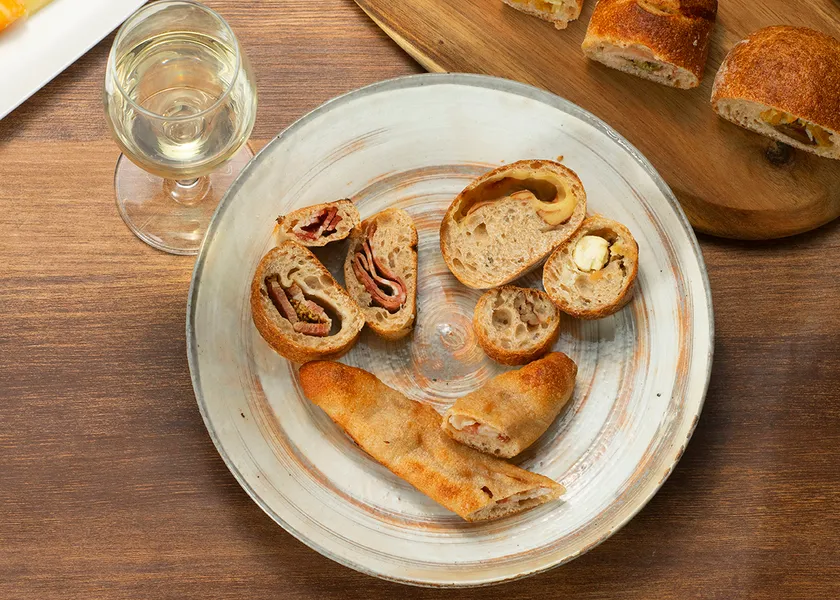 燻ベーコン、三元豚ロースパストラミ、熟成オリーブの実、大粒の栗、大人のブルーチーズなどの具材は、風味が良いスペルト小麦と合わせることで食材の旨味がより際立ち、強めの味のハード系パンはワインによく合います。