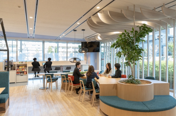 中央のテーブルでは複数のグループが同席できるので、社員同士のコミュニケーションが生まれる場となっています。
