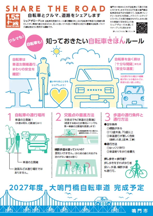 2027年度の大鳴門橋自転車道完成予定を見据えて、「自転車フレンドリーなまち」を目指し、ドライバーとサイクリストそして市民の皆様はもちろん本市に訪れた皆様の「安全安心」のため『シェア ザ ロード』を通してマナーアップの啓発に努めています。