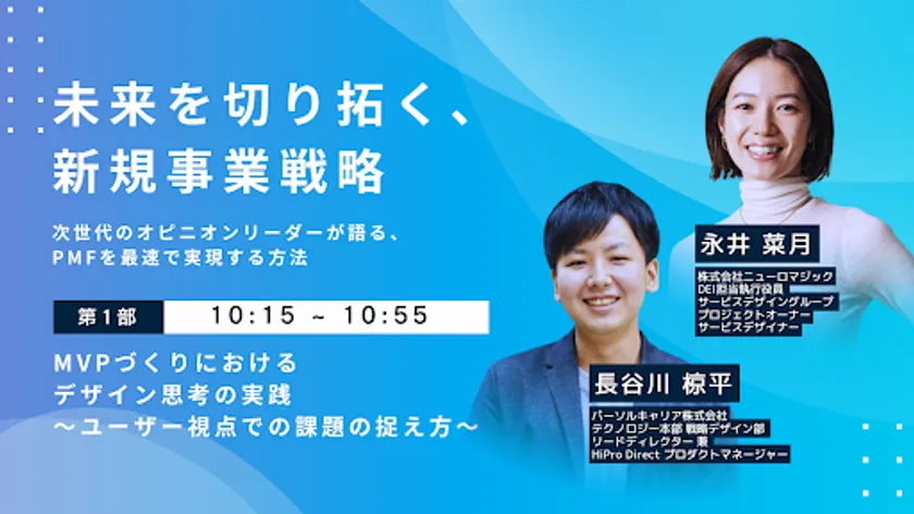 当社はパーソルキャリア様より「新規サービスの開発において活用されているデザインスプリントをより再現性が高い手法に昇華させたい」という依頼を受け、オーダーメイドのデザインスプリントを提供、実施伴走いたしました。今回のセミナーでは、プロジェクトの担当者であった当社サービスデザイナーの永井と、現在はHiPro Directのプロダクトオーナーを務められている長谷川様にもご登壇いただき、デザインコンサルタントとプロダクトオーナーという異なる立場から新規事業の課題と解決策を議論いたします。当時課題となっていたデザインシンキングの実践やデザインスプリントの活用から、単なる手法に留まらず、MVP検証までに直面しやすい課題についてどのようにアプローチすべきか、事例を交えて具体的に議論、お話いたします。事例紹介:https://www.neuromagic.com/works/persol-career/