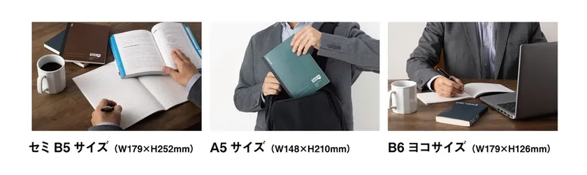 持ち運びやすいA5サイズをメインに、記入量の多い勉強に使いやすいセミB5サイズ、パソコンやタブレットと併用しやすいB6ヨコサイズの3サイズを、学ぶスキルに合わせて展開しています。