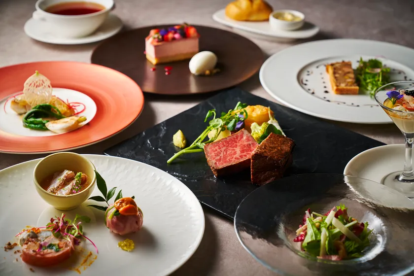 炭火焼きステーキをメインに冬の味覚を存分に味わえるお料理の数々。四季折々の素材を随所に散りばめた冬のスペシャルディナーコースに仕上げました。豪華食材で彩るアミューズ、三種の前菜が並ぶオードブルは鳥取和牛のイチボ肉を使った手毬寿司に注目を。フレンチの王道と言われるパテ・アン・クルートを楽しんだ後は、時間をかけて香ばしく焼き上げた甘鯛の鱗焼きをご賞味ください。メインは噛むほど脂が溢れてとろける鳥取県産の炭火焼ステーキをご用意。デザートは苺を中心に構成したムースにミルクジェラートを添えて、最後の一口までご堪能ください。