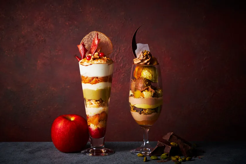 冬のご褒美スイーツは、冬食材をたっぷり使用した2種のパフェをご用意。「りんごとほうじ茶のパフェ」はじっくり煮詰めたりんごのキャラメリゼと、ミルクやクリームチーズの優しい甘さ、香り高いほうじ茶のカスタードクリームが織りなすハーモニーをお楽しみください。「チョコレートとピスタチオのパフェ」はカカオバターを多く含むクーベルチュールチョコレートを使用。ひとさじ食べ進める度にカカオニブや砕いた香ばしいナッツ、オレンジチップなどの素材が顔を覗かせます。