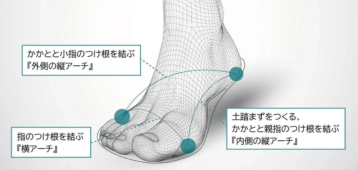 ・足の障害予防・・・足の骨格の3つのアーチに常にフィットして体重を支えることで、偏平足、開帳足、外反母趾などの予防に繋がります