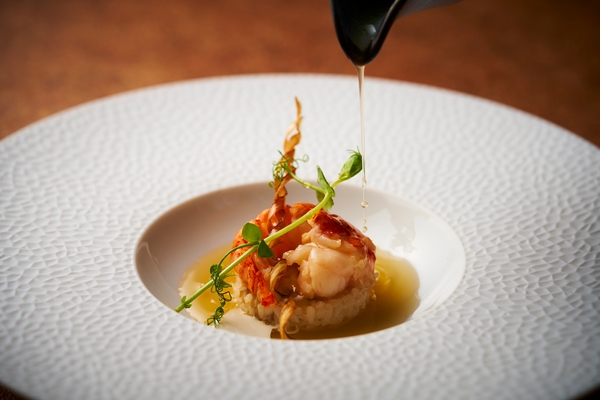 魚料理は″オマール海老の窯焼き ブルーチーズのクリームニョッキと牛蒡のキュイソンにしたもの″。香ばしく焼き上げたオマール海老の下には、クリームニョッキと牛蒡の風味が豊かなご飯をセット。オマール海老をいただいた後に、海老の旨味がぎゅっと濃縮された出汁で、ニョッキとご飯をリゾット風にお召し上がりいただけます。