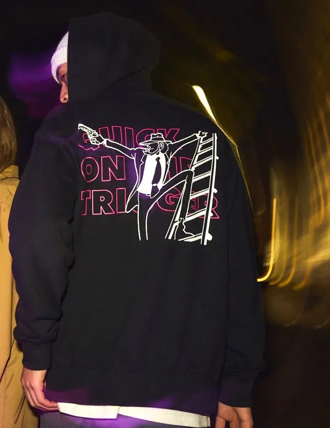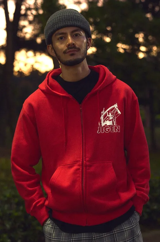 ジップパーカーの胸元には銃を構える次元の姿!背面にはPART2のOP素材を使用し、はしごを下りながらも冷静に狙いを定める姿をレトロポップ風にデザインしました。次元ファン必携の一着です!
