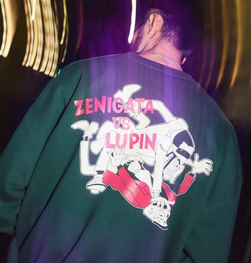 ルパンと銭形の絆が感じられる人気回、PART2第30話「モロッコの風は熱く」より宿敵ともいえる2人の姿を背面にデザインしたビッグサイズトレーナー。追って追われて、捕まっては逃げる。2人の変わらない関係性が表れた一枚です。