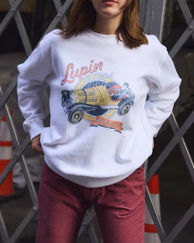 もう一種類はPART1のOPより、愛車に乗るルパンのシーンを使用したトレーナー。かすれ加工が施されているため、ヴィンテージ感のあるデザインとなっております。