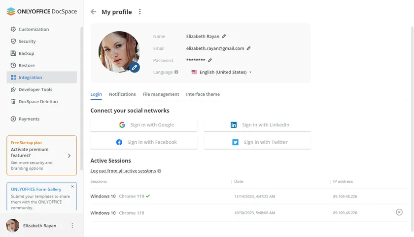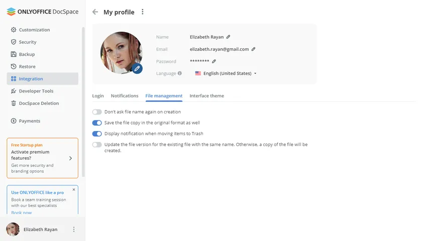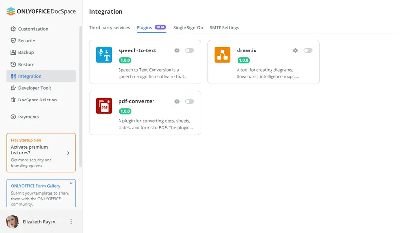 最新のアップデートでは、DocSpaceの機能を拡張できるシステムプラグインが組み込まれました。このようなプラグインは、DocSpaceの所有者と管理者が統合設定を使って有効にすることができます。有効化されたプラグインは、すべてのユーザーが利用できます。