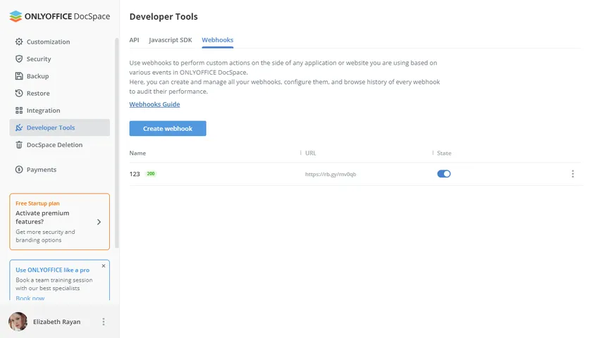 追加されたWebhooks設定により、DocSpaceの様々なイベントに基づいて、アプリケーションやWebサイト側でカスタムアクションを実行することができます。