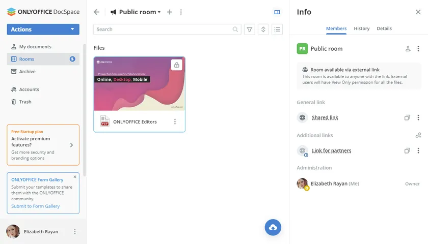 新しく追加されたパブリックルームは、第三者との文書作業をより簡単にします。外部リンクを介してユーザーを招待し、登録なしでファイルを閲覧することができます。必要に応じて、ユーザーは様々なアクセス許可を設定するために、異なるパラメータで複数の外部リンクを生成することができます。パブリックルームのドキュメントを保護するために、パスワード保護、ファイルコンテンツコピー制限、ファイルのダウンロードと印刷制限が利用可能です。