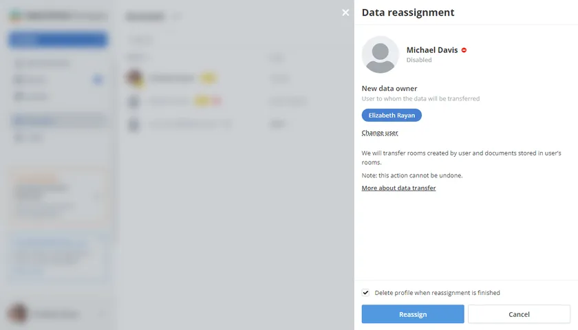 今後、ONLYOFFICE DocSpaceの管理者は、無効ステータスのユーザーに属するルームとルーム内に保存されたファイルを再割り当てすることができます。データの再割り当ては、操作を行っている管理者に行われます。また、手動で別の割り当て先ユーザーを選択することも可能です。