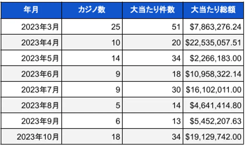 2023年10月時点での米国カジノのジャックポット当選件数と総額01