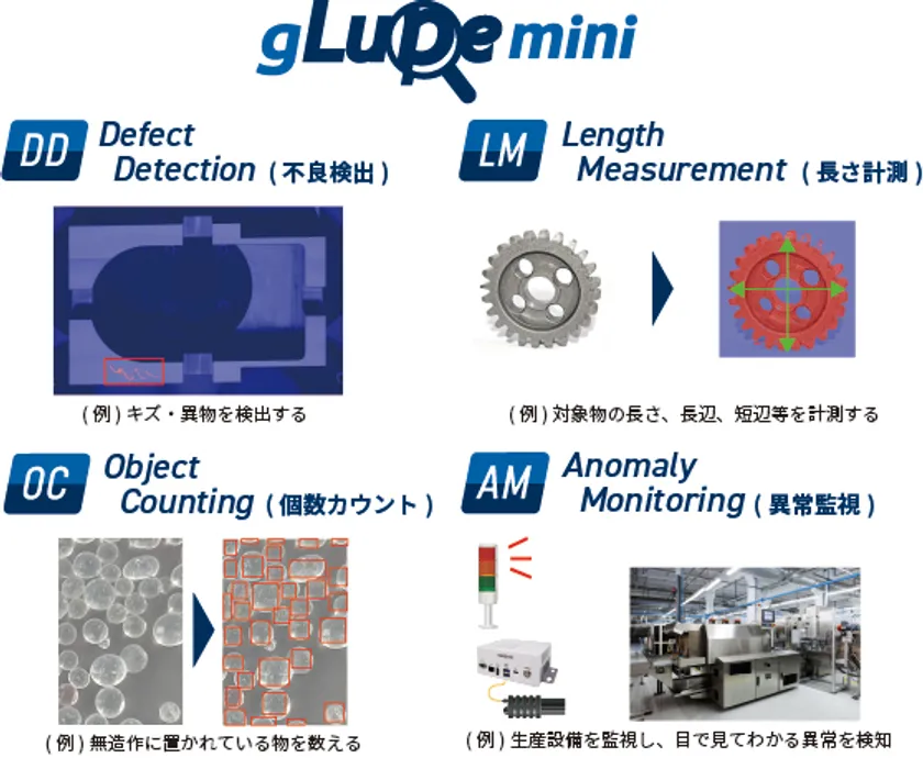 『gLupe mini』が提供する機能は「不良検出」「長さ測定」「個数カウント」「異常監視」。画像1枚あれば学習できる簡単かつ高性能な当社独自AIと、ルールベースを組み合わせたこれまでに無い手法により、人手に頼るしかなかった検査・点検業務の自動化を実現します。