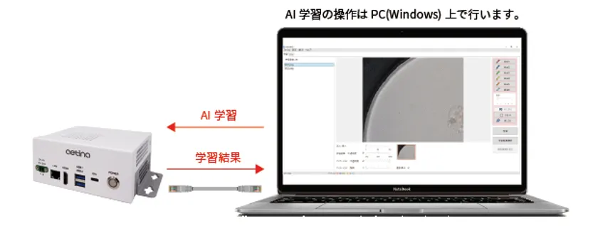 gLupe miniとgLupe学習用ツールをインストールしたWindows PCを接続し、PC上の画面で操作してAI学習を行います。1枚から数枚の画像でAI学習でき、処理時間も数秒のため、簡単に高性能AIを構築することが可能です。AI学習の処理はgLupe miniで行うため、接続するPCは普段お使いのPCで問題なく、AI学習用のハイスペックPCを用意する必要はありません。