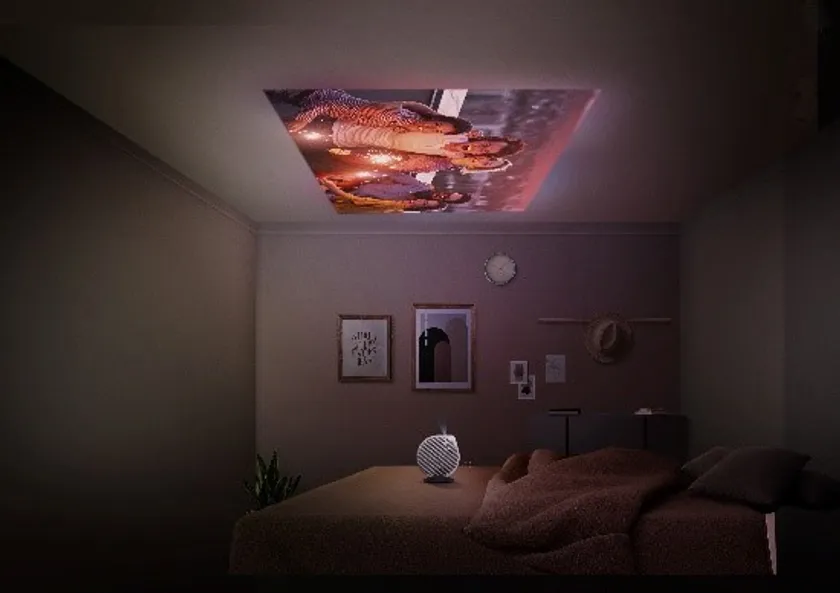 135度の角度調整機能を搭載し、寝ころびながら大画面の映像を楽しむことができます。天井やロフト等、これまではデッドスペースとなっていたような空間にも自由自在に投影可能。また、自動縦台形補正とオートフォーカス機能を搭載(*1)しているため、ストレスフリーで家族や友人、恋人とリビングのみならず寝室で寝ころびながら特別な時間を過ごすことができます。さらに、ハンドストラップや専用キャリングケース(*2)も付属し、持ち運びも容易な製品となっているため、友人宅や旅行先でも場所を問わずリラックスできる空間を構築できます。