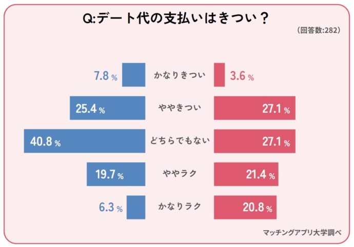 今回の調査では、男女282人にデート代について聞いてみました。自粛ムードが明けて食事やお出かけが楽しめるようになった一方で、デート代の支払いが「きつい」と感じる人も。