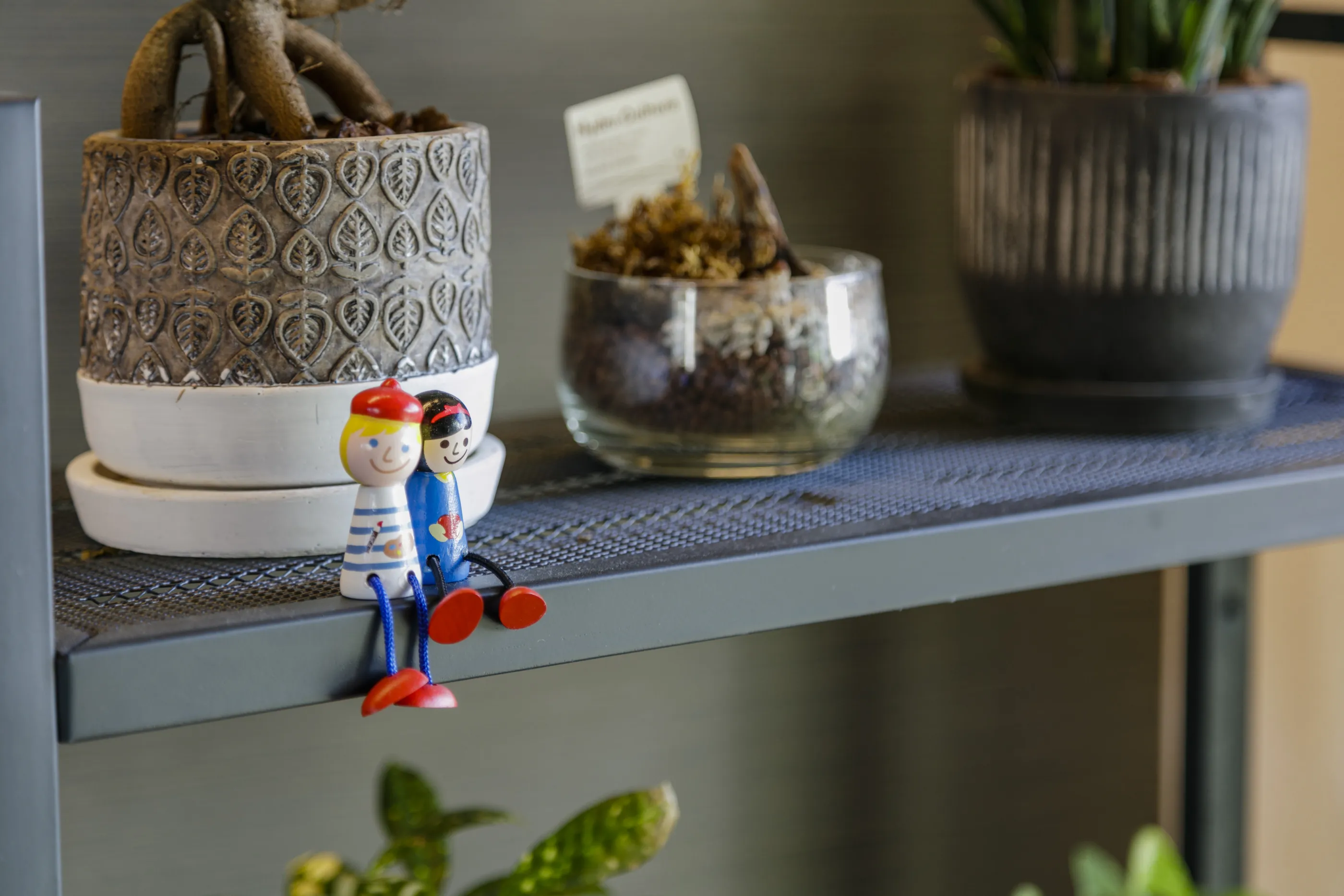 床の色味も踏まえキッチンのベースはブラックにし、差し色として植木や植物の緑を置きスタイリッシュにまとめています。