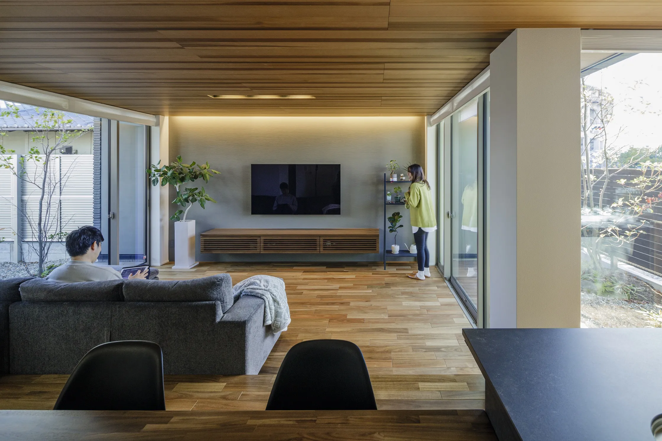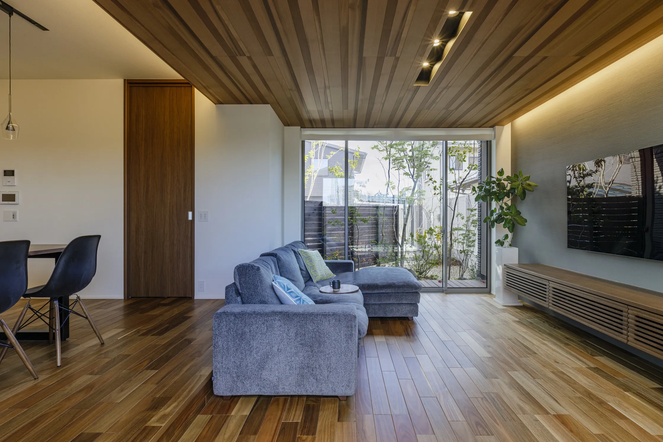 アカシアの床材と天井の木が共鳴する、くつろぎのリビング