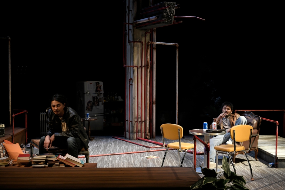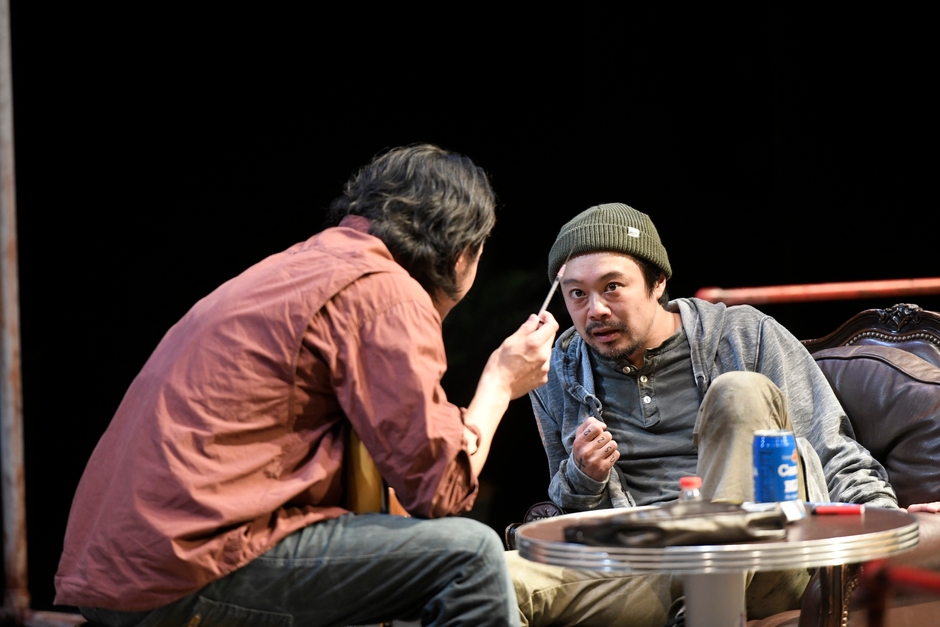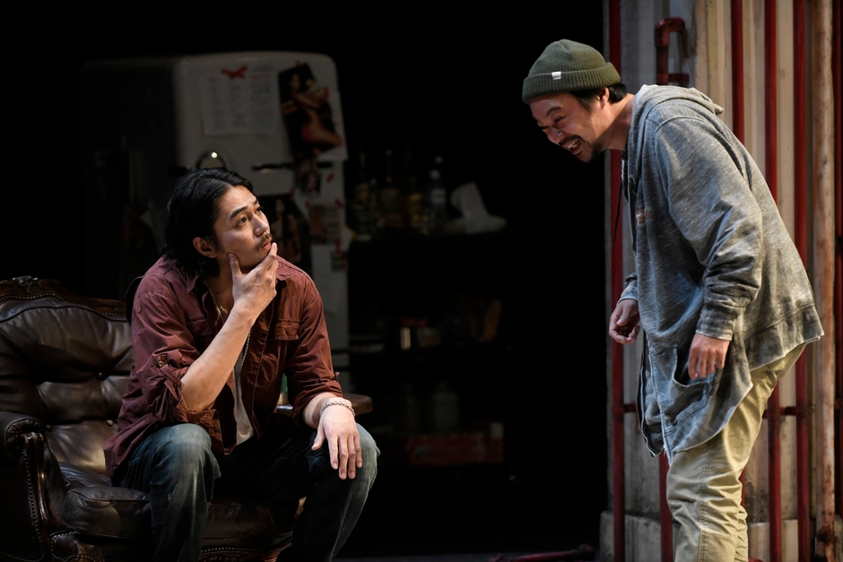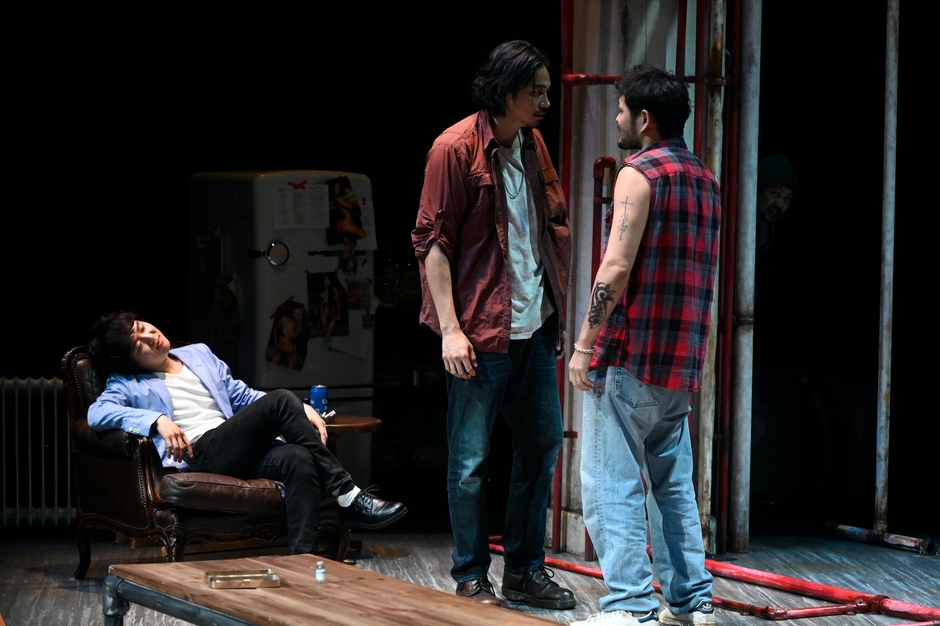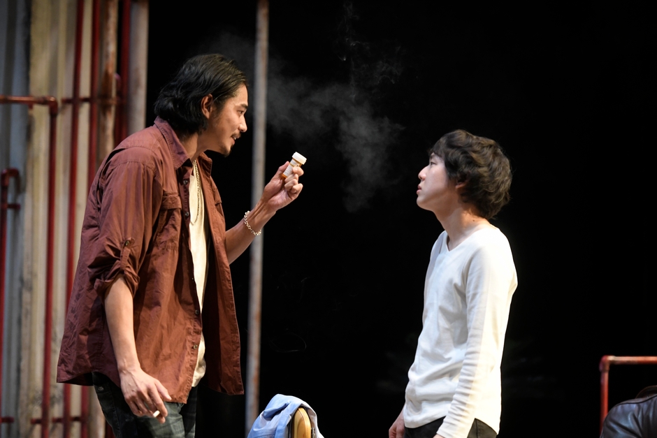 まず心を掴まれるのが、その空間づくりだ。三方囲みの舞台は、演者と観客の距離が近く、4人の間に生まれるスリリングな気配が臨場感たっぷりに伝わってくる。むき出しの鉄管が用いられた舞台美術は、柵のようにも檻のようにも見え、ジャンキーたちの悪巧みを檻の外から覗き見しているような気分になる。