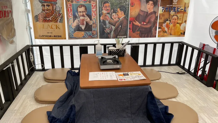 屋外の牡蠣小屋にあったかコタツブース完備!